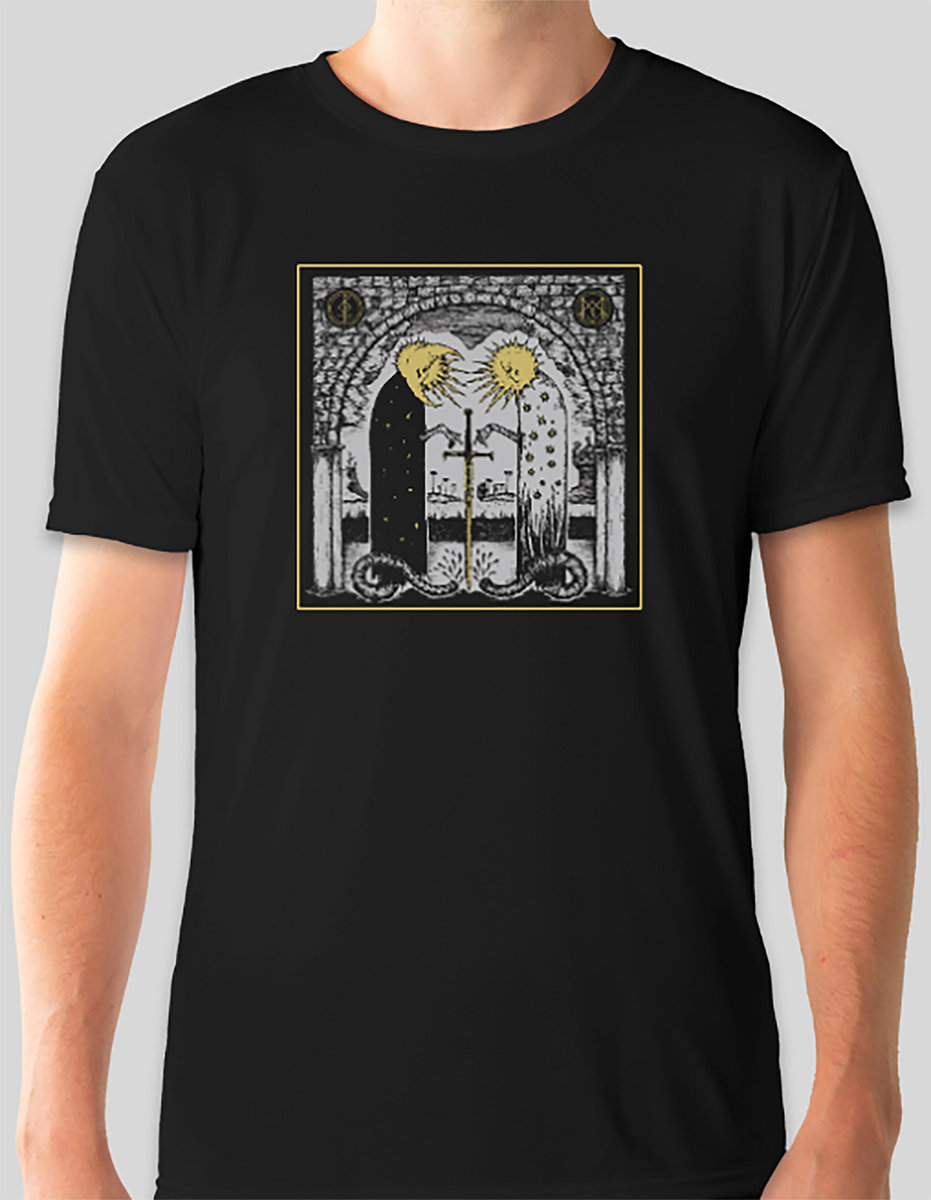 2 colour silkscreen print of the cover artwork created by hagiophobic on black Gildan Softstyle, 100% cotton shirts.